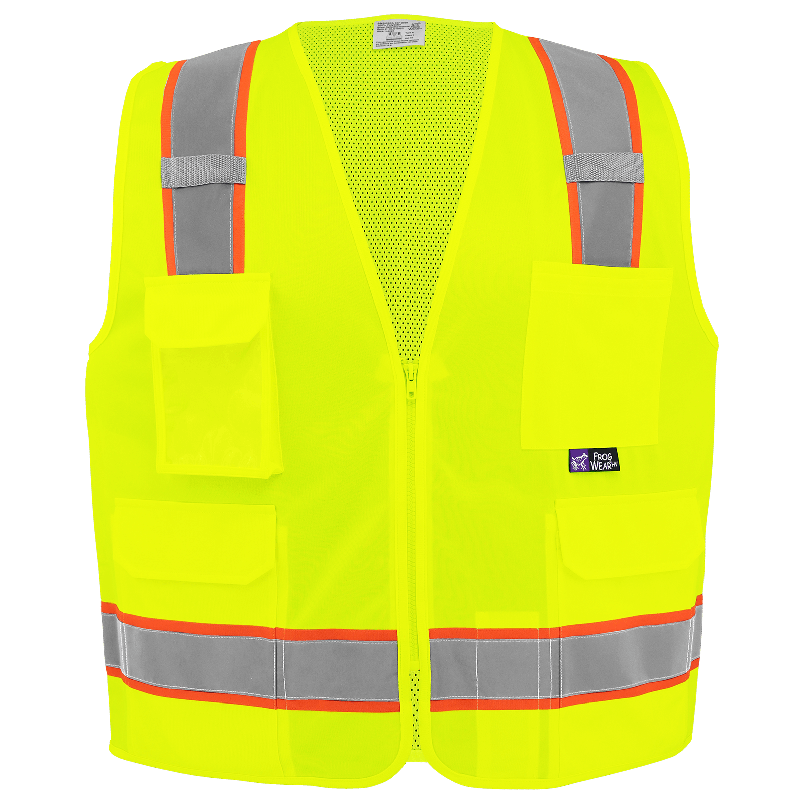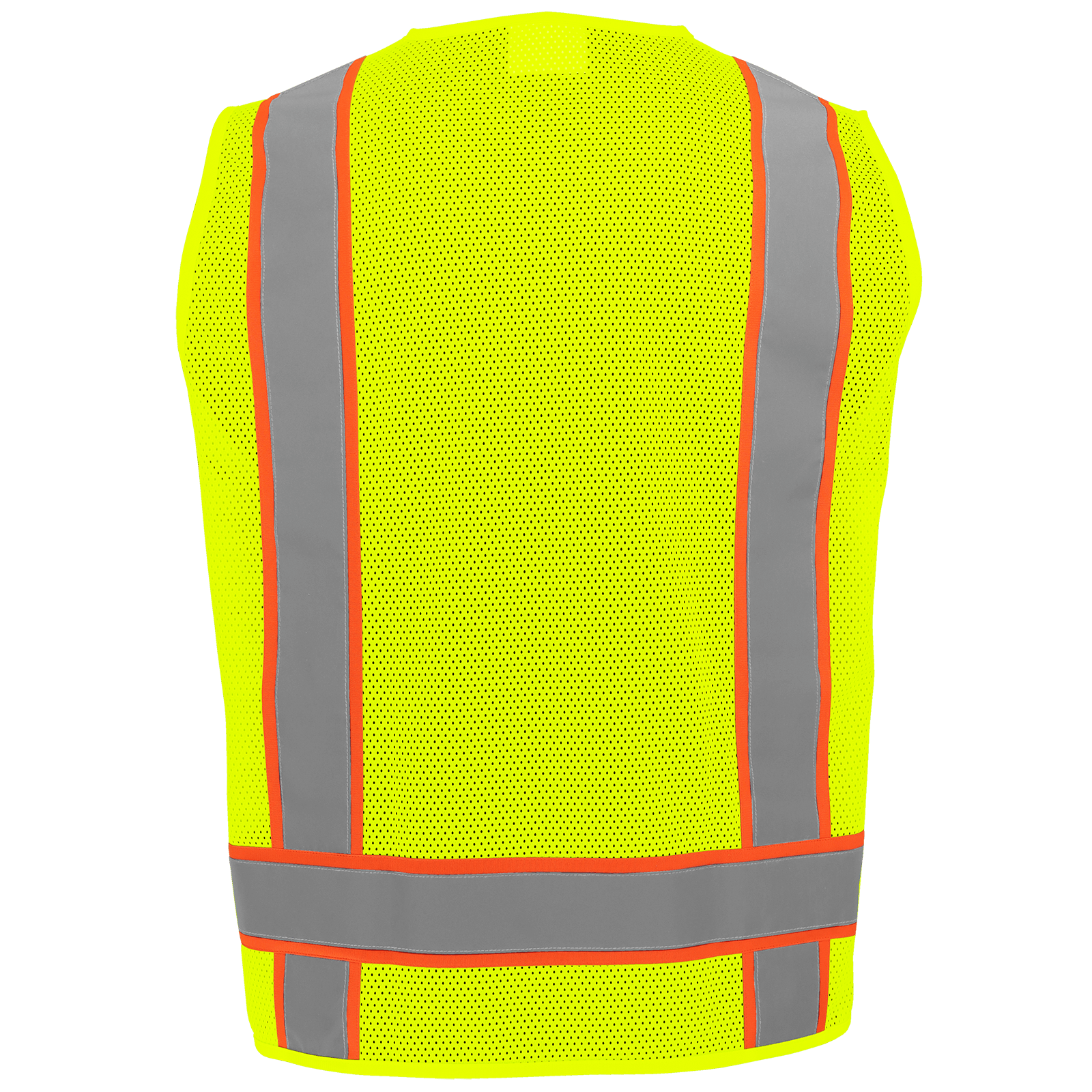 This surveyor's safety vest is high-visibility yellow/green and has a lightweight solid polyester front with a mesh back. The silver reflective material with contrasting orange trim enhances visibility in low-light conditions. The vest features mic tabs on the shoulders and a clear name tag holder. Four outside and three inside pockets, including an outer left breast pocket with two tiers and four pen/marker holders. The zipper closure provides a secure fit.