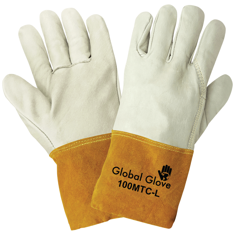 The premium welder features a soft cowhide leather shell and a 4-inch straight, split leather gauntlet cuff. It is sewn with aramid fiber for added heat protection and includes a wing thumb for comfort and ease of grip.