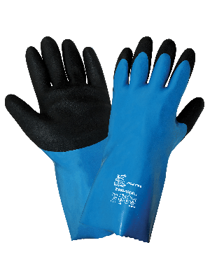 These super flexible, 12-inch, premium gloves are made of a nitrile/PVC blend and feature a sandpaper finish on a seamless inner 18-gauge liner. Nitrile provides chemical resistance and blended with 70% PVC, adds additional flexibility. These gloves stay flexible in low temperatures and the sandpaper grip enhances the handling of slippery objects wet or dry.