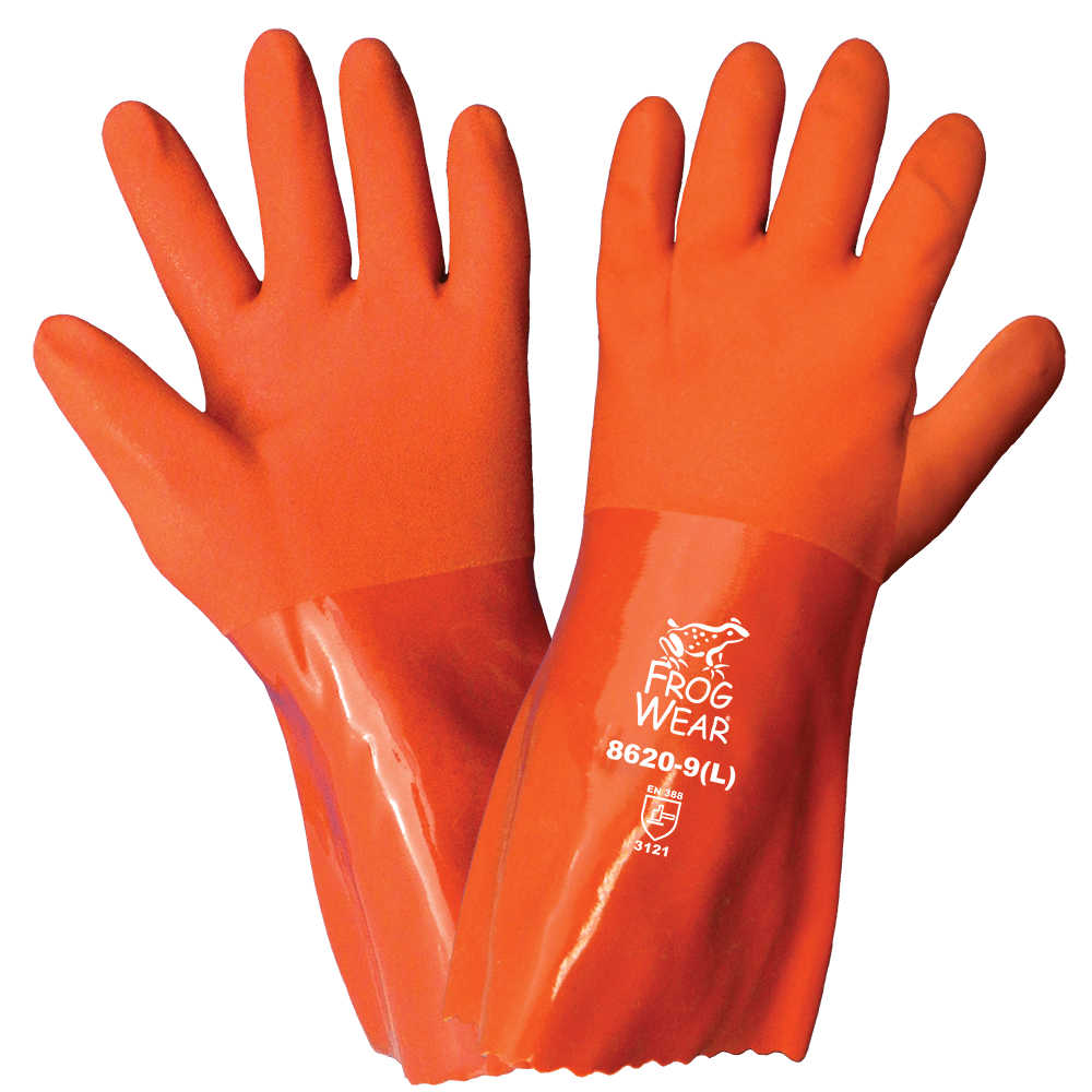Featuring a sandpaper grip, this 12-inch glove is double-dipped with PVC on a seamless cotton liner. It is specially formulated for the handling of chemical residues, oils, or greasy materials and stays flexible in temperatures down to -5°F. It has also been treated with Actifresh® to minimize the bacteria that would lead to odors.
