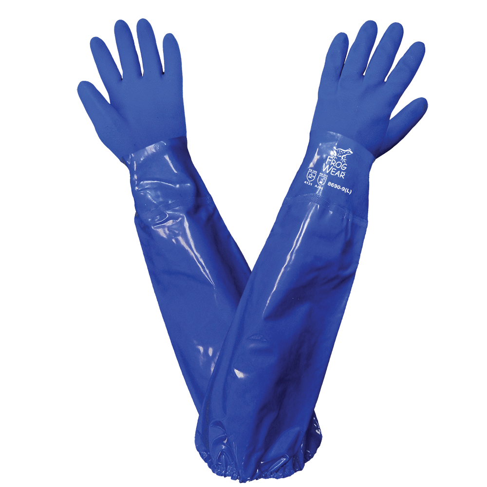 These shoulder-length seamless triple dipped PVC gloves are specially formulated for handling chemical residues, oils, or greasy materials. They stay flexible in temperatures down to -5°F and feature a sandpaper grip to enhance the handling of slippery objects wet or dry.