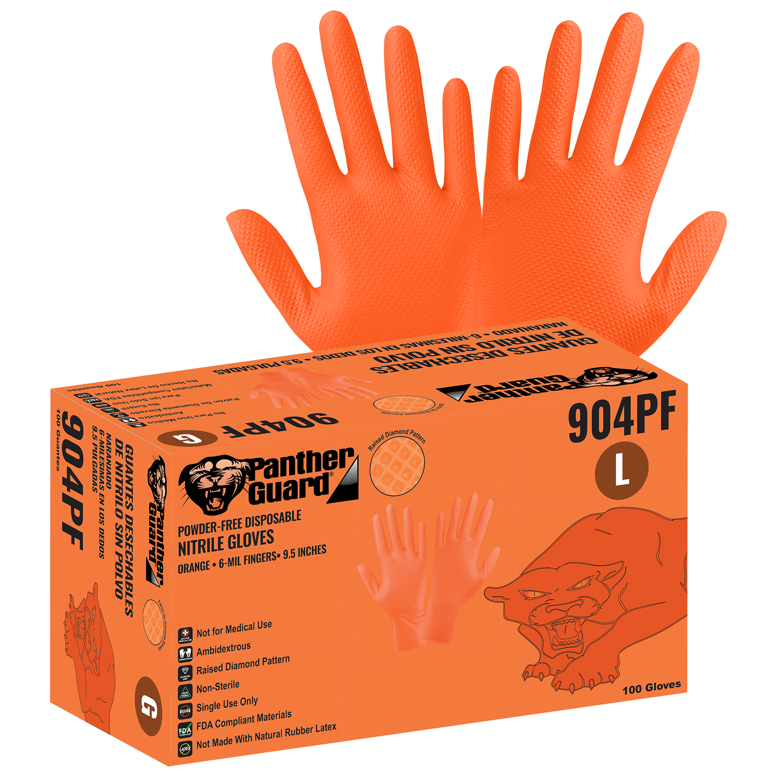These high-visibility orange gloves are made of 6-mil premium powder-free nitrile. Their raised diamond pattern ensures a better grip than conventional disposable gloves. They are ambidextrous, 9.5 inches in length, and have a rolled/beaded cuff. There are 100 gloves to a dispenser box, 10 dispenser boxes per case. These gloves comply with FDA regulations for food contact and are ANSI/ESD anti-static/electrostatic compliant.