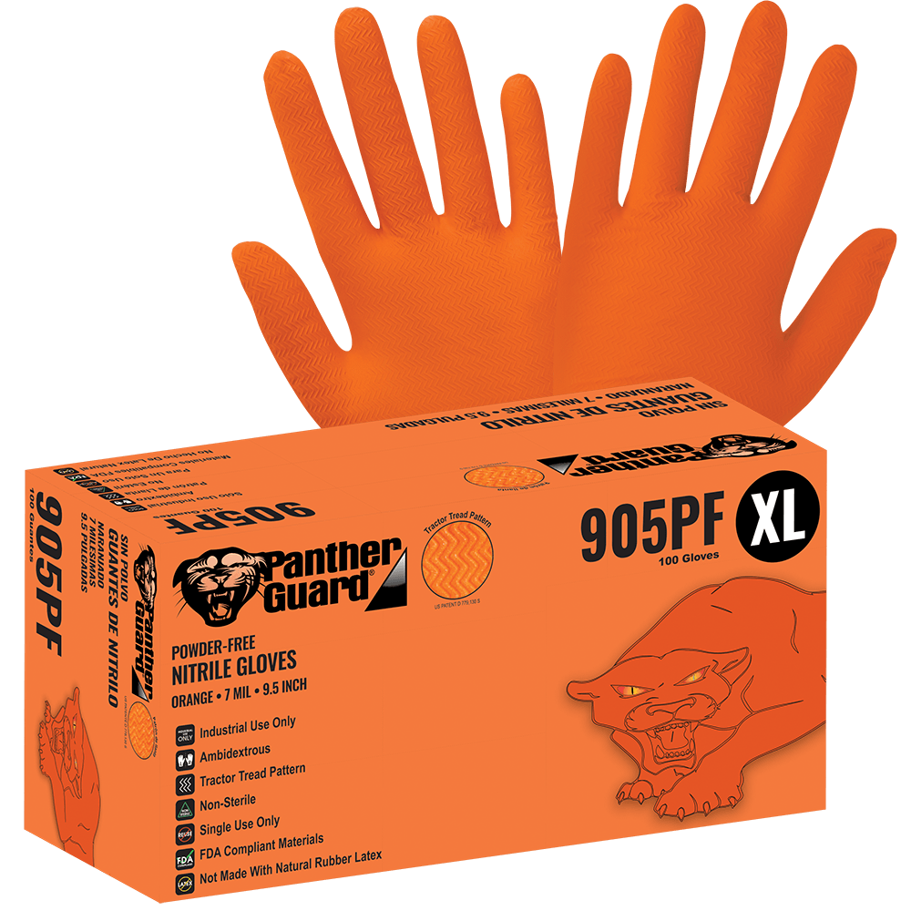 These gloves are made of 7-mil high-visibility orange powder-free heavyweight nitrile. They feature a Tractor Tread patterned grip for an excellent wet, oily, or dry grip. They are disposable, ambidextrous, 9.5 inches in length, and have a rolled/beaded cuff. The gloves come 100 gloves to a dispenser box, 10 dispenser boxes per case, and comply with FDA regulations for food contact. This glove is appropriate for use in an ESD Protected Area.