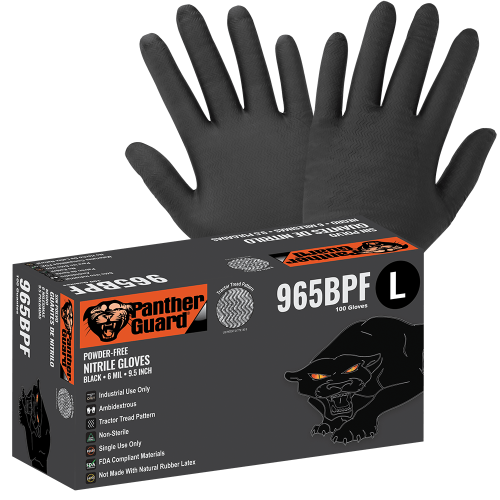 These gloves are made of 6-mil black powder-free nitrile. They feature a Tractor Tread patterned grip for an excellent wet, oily, or dry grip. They are disposable, ambidextrous, 9.5 inches in length, and have a rolled/beaded cuff. The gloves come packaged 100 gloves to a dispenser box, 10 dispenser boxes per case, and they comply with FDA regulations for food contact.