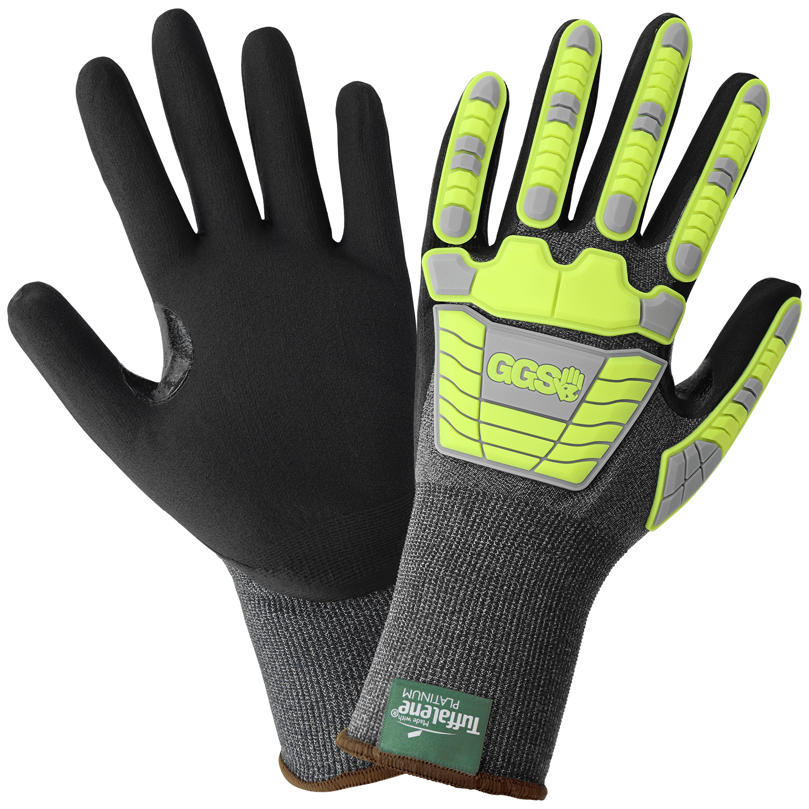 This ultra-lightweight cut-resistant glove has a salt-and-pepper seamless 21-gauge Tuffalene® Platinum UHMWPE shell. The palm is black with a New Foam Technology finish on the nitrile coating and includes a reinforced thumb crotch. The back of the hand has ultra-thin gray and high-visibility yellow TPU impact protection over the fingers and metacarpal bones. This glove features touch screen compatible fingertips and a knit wrist.