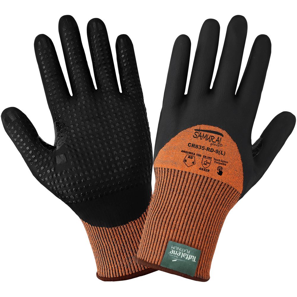 These cut-resistant gloves have a 15-gauge high-visibility orange seamless Tuffalene® Platinum UHMWPE shell. Our innovative Tuffalene® Platinum offers extra comfort, protection, and durability — Free from glass fibers or metal enhancements to achieve this level of cut protection. This uniquely crafted material is cooler and provides a more comfortable user experience while also retaining a puncture resistance comparable to enhanced fibers. Gloves made with Tuffalene® Platinum last longer than enhanced gloves due to the inherent abrasion resistance of the fiber construction. Because Tuffalene® Platinum gloves are constructed without metal or glass fibers, particles of these fibers do not contaminate other materials during handling. The palm is three-quarter coated in black foam nitrile with nitrile dots for extra grip. Features a nitrile reinforced thumb crotch, touch screen compatible fingers, and a knit wrist to prevent gloves from slipping.