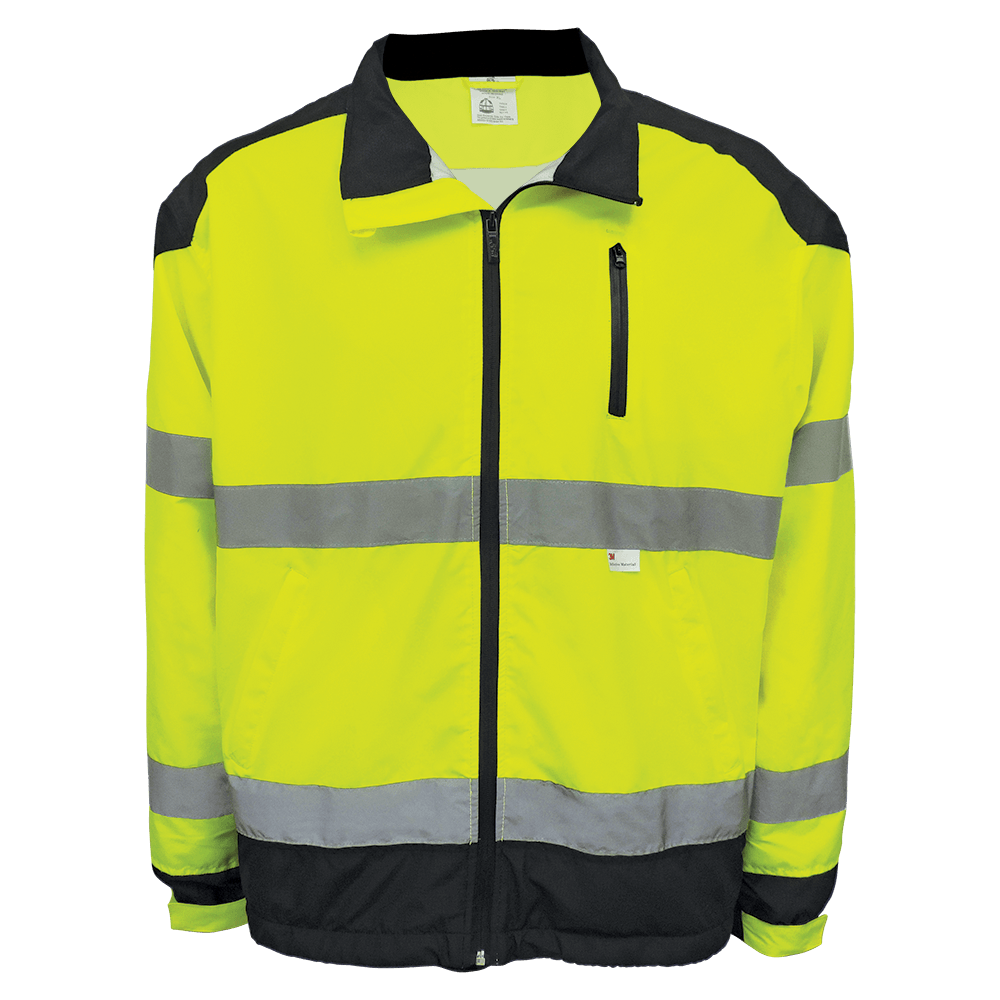 This premium high-visibility windbreaker jacket is made with solid polyester material. Featuring three pockets, a black bottom, a fleece liner, and 3M™ reflective material for good low-light visibility.
