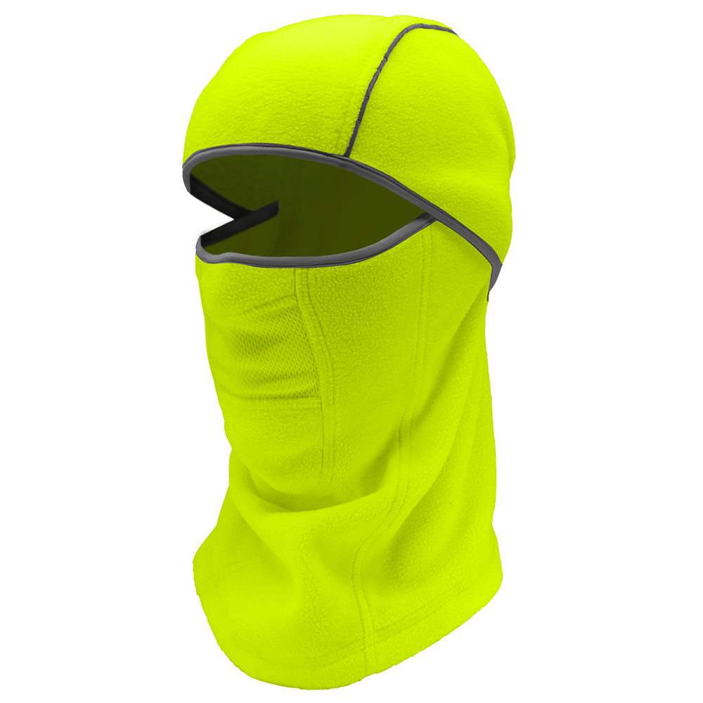 This shoulder length high-visibility yellow/green thermal balaclava is made from soft 250g/m² fleece material and features a silver reflective accent logo. The hinged design allows these balaclavas to be worn in several different ways. The design provides comfort and warmth when worn either alone or under a helmet. The mouth panel is constructed from breathable mesh which helps prevent eyewear from fogging and allows increased airflow. One size fits all.