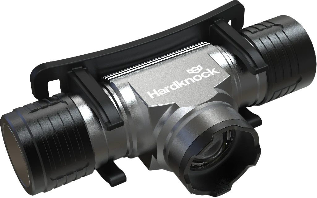 Designed to work with Resolve helmets and help shed light on any project, the Hardknock Headlamp is super tough and crazy bright. With a handy magnetic base, it can pull double duty, going from helmet to metal surface and back again. Make hard look easy. This swivel headlamp mounts with staps using multifunctional rail clips. 1050 Lumens, 3 light modes (low, med, high), magnetic on side, USB-C Rechargable, 130 grams. Made of aluminum and IPX4 water resistant. Run time of ~8hrs @ 100LM, ~5hrs @500LM, ~1.5hrs @ 1000LM.