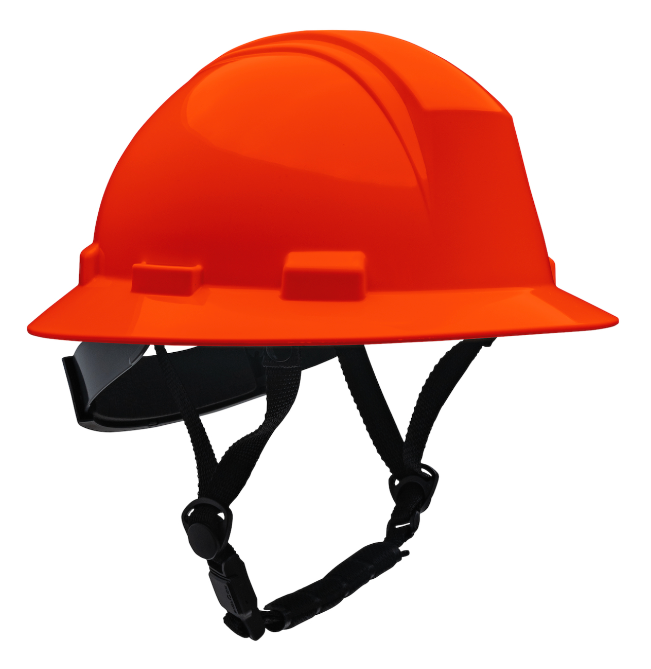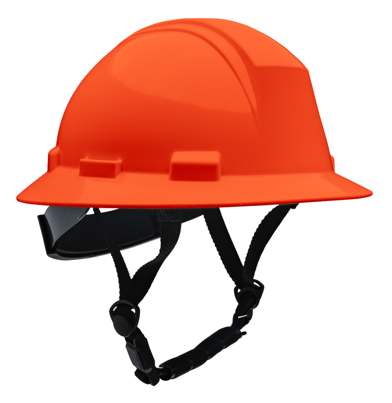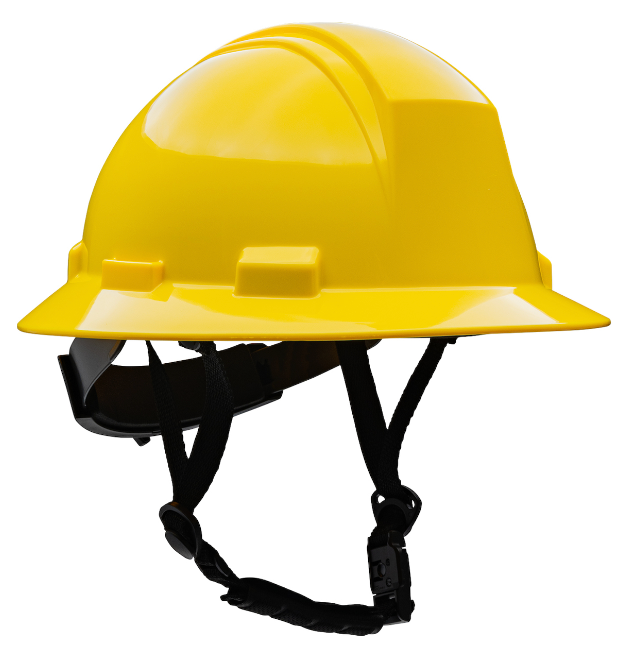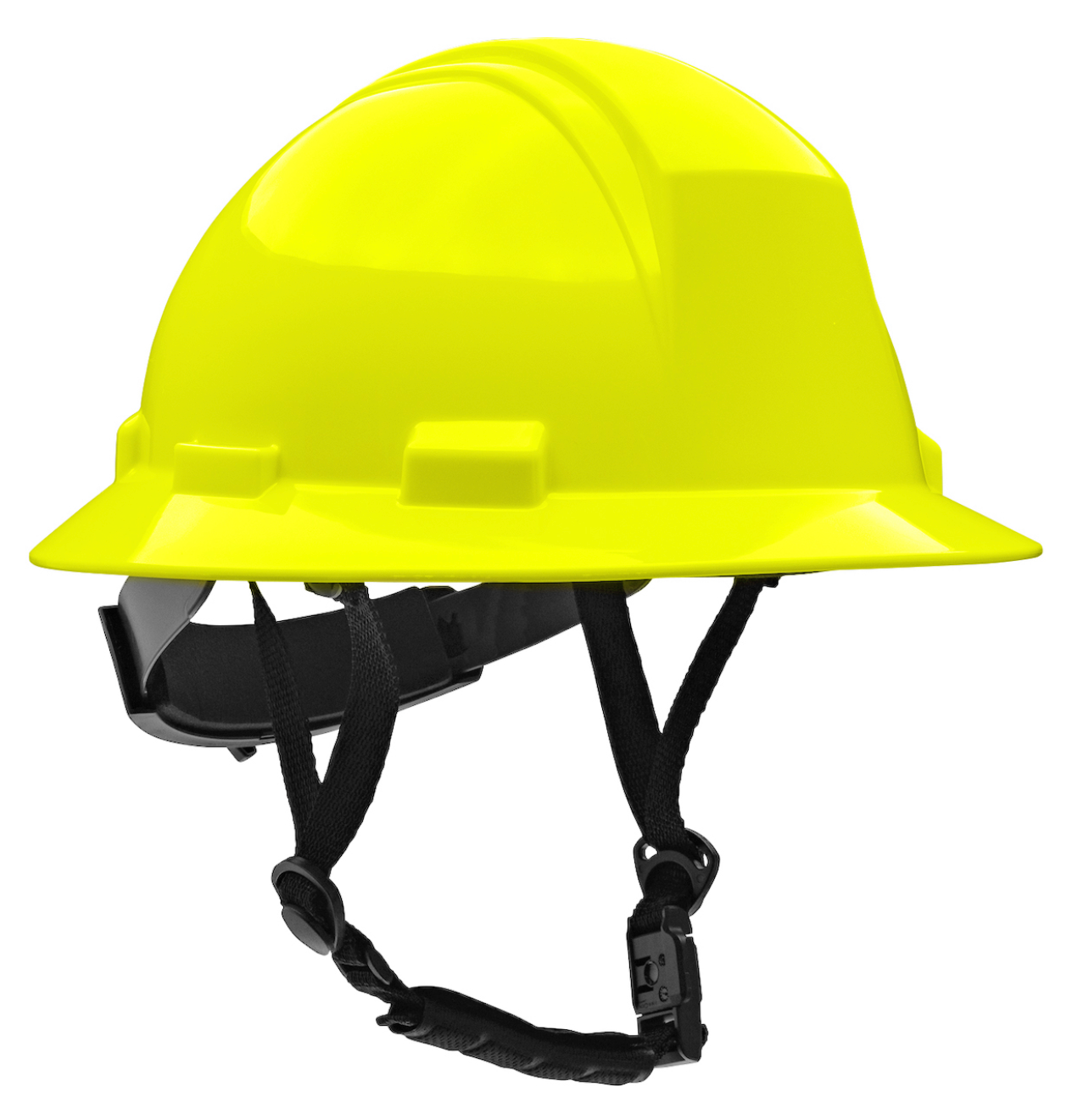 Type II Full Brim Safety Helmet with HDPE Shell, 4-Point Textile Suspension, Wheel Ratchet Adjustment and 4-Point Chinstrap