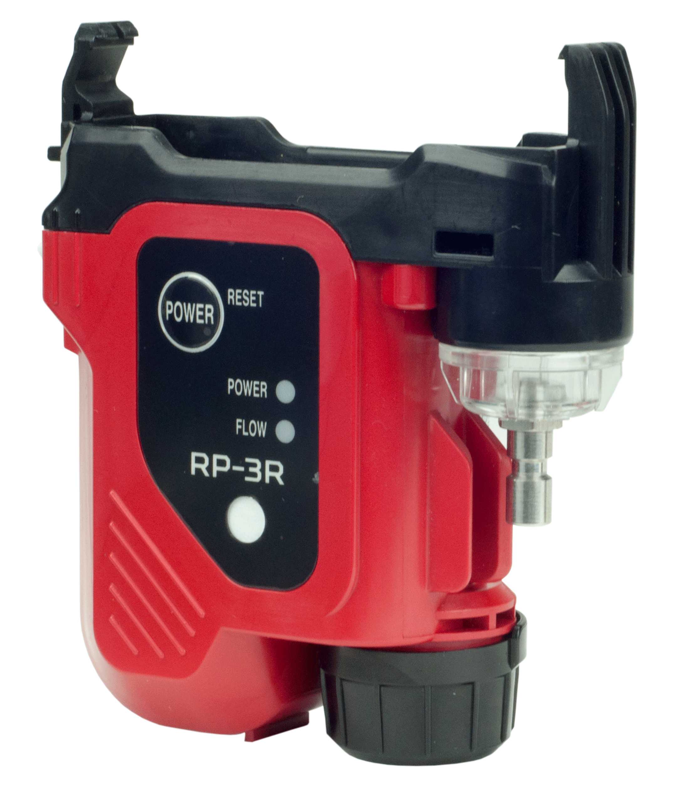 A push button POWER switch is used to activate the RP-3R, and the POWER LED illuminates when the RP-3R is on. If a low flow condition occurs, the FLOW LED flashes and an audible alarm will sound. The POWER LED flashes if low battery occurs.